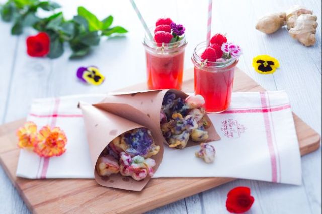 Una croccante frittura di fiori eduli in pastella, da sgranocchiare sorseggiando un freschissimo cocktail a base di frutta con tutto il twist dello zenzero.. magari a bordo piscina in giardino oppure distesi su un amaca a farsi dondolare dalla brezza di primavera.. perché no un ottima idea I fiori commestibili, spesso costituiscono un elemento decorativo in piatti raffinati, ma talvolta sono ottimi per una versione street food e molto pop.Una raccomandazione: i fiori commestibili non sono quelli che si comprano dal fioraio, ma si trovano già puliti e selezionati in comode vaschette, nei mercati e supermercati più riforniti, o nelle erboristerie, a patto che non siamo dei conoscitori appassionati o si decida di coltivarne con qualche accortezza anche sul vostro balcone o nel vostro giardino sono tra l’altro semplicissimi. Basta scegliere tra le molte varietà commestibili rose, gardenie, garofani, glicine, acacia, lavanda e coltivarli al naturale, senza trattarli con pesticidi o fertilizzanti chimici; si colgono al mattino, appena evapora la rugiada e maggiore è il loro contenuto d’acqua, si friggono con le più svariate pastelle e sono buonissimi da mangiare, potrete anche stupire i vostri ospiti nel caso vogliate condividere queste squisitezze finendo il pasto con della frutta fritta in pastella caramellata si tratta di pezzi di frutta passati in una pastella leggera e spumosa, fritti e poi intinti in un goloso caramello bruno.Potete preparare la frutta fritta caramellata con la frutta che preferite, meglio se di stagione: noi abbiamo utilizzato mele, pere e banane.La frutta fritta in pastella caramellata può essere uno dei finger-food che andranno ad arricchire i buffet delle vostre feste.