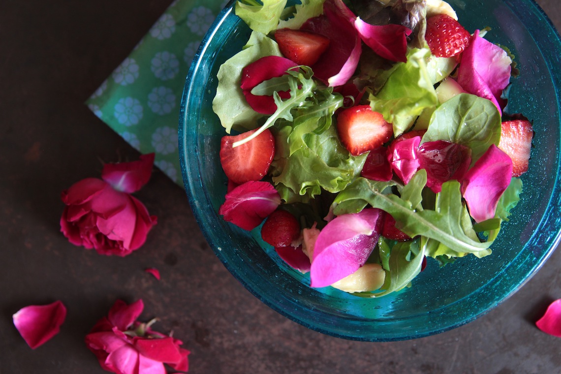 L’insalata di rose ama andare a braccetto con il profumo delle fragole, ma anche di altri frutti di bosco: mirtilli e lamponi posso arricchirla di gusti e colori stuzzicanti Tra maggio e giugno in ogni giardino sbocciano rigogliose le rose. Tutte quelle coltivate senza trattamenti possono avere un utilizzo alimentare: le rose sono meravigliose per sciroppi, dolci, aperitivi, ma anche per risotti, frittelle e frittate. Il loro profumo rende davvero speciale anche il piatto più semplice. Dal vaso alla padella non perdono certo lo charme.Ecco una ricetta che potrete presentare per un antipasto decisamente originale..Ingredienti 1 manciata di misticanza mezzo avocado maturo 1 rosa non trattata 1 manciata i fragole olio mezzo limone sale distribuire in una ciotola la misticanza, le fragole mondate e tagliate a metà, quindi l’avocado in “falde” ottenute con un cucchiaino e i petali di rose profumati. Cospargere il tutto con un poco di sale e condire con un filo di olio extravergine. Per ottenere un po’ di croccantezza, a piacere, potete anche aggiungere una manciata di semi di sesamo tostati pochi minuti in una padella antiaderente.