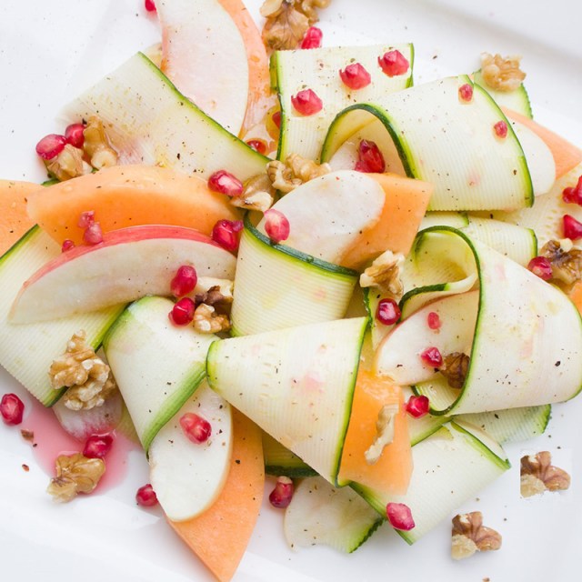 Un’idea originale e piacevolmente fredda per i vostri contorni estivi, il carpaccio di zucchine e melone con mele, noci e melagrana. Il carpaccio di zucchine e melone è una ricetta rapida e semplice da preparare, un’ottima idea per un contorno estivo fresco e sfizioso. Appropriato ad accompagnare ogni tipo di piatto che sia di carne o di pesce, richiede pochi minuti per la preparazione perché gli ingredienti sono tutti crudi marinati con olio e spezie. Lavate le zucchine, eliminando le estremità, e con la affetta verdura tagliatele a fettine molto sottili. Poi disponetele in un’insalatiera dove verranno marinate. In una ciotolina mette olio, il succo di limone, sale e pepe, e mescolate il tutto. Con questo composto condite le zucchine in maniera uniforme e lasciatele marinare. Poi pulite il melone e tagliatelo a fette non troppo grandi ma fini e in seguito a metà. Sbucciate la melagrana e estraetene i chicchi rossi e dolci che daranno colore al nostro piatto. Sbucciate anche le noci e dividetele a pezzetti. Ora passate all’unione del piatto, divertendovi ad impiattare in maniere creativa tutti gli ingredienti così da portare in tavola una vera delizia sia per gli occhi che per il palato