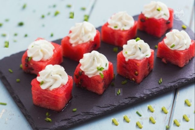A tavola perdonerei chiunque, anche i miei parenti.” (O. Wilde) Oggi vi proponiamo un antipasto alternativo per la vostre tavole estive: anguria e feta. Questo particolare abbinamento va prima assaggiato e poi giudicato, perché sicuramente l’idea di accostare il profumo fresco dell’anguria con il sapore forte della feta possa far sorgere qualche dubbio. Questo è uno dei tanti antipasti alternativi per la vostra tavola estive: anguria e feta. Questo particolare abbinamento va prima assaggiato e poi giudicato, perchè l’idea di accostare il profumo fresco dell’anguria con il sapore forte della feta possa far rabbrividire qualcuno, ma al primo assaggio vi ricrederete subito e quando il piatto sarà vuoto, ne vorrete ancora. Come vi dicevamo non soltanto l’anguria e la feta si sposano bene insieme ma il sapore dell’uno esalta quello dell’altro. Solitamente l’anguria e la feta vengono servite sotto forma di insalata con entrambi gli ingredienti tagliati a cubetti. In questo modo potete servirli come antipasto e finger food tagliando uno spicchietto di anguria e adagiandoci sopra una fettina triangolare di feta. Ad esaltare ancor di più i sapori c’è la rucola e la glassa di aceto balsamico, ma potete sostituire quest’ultimo ingrediente con il miele. I sapori sono agli antipodi, ma riescono a regalare entrambi delle particolari note di gusto. Del resto sappiamo tutti che l’aceto balsamico si sposa bene con la frutta e che il miele sta benissimo con il formaggio. Quindi, provare per credere quanto sia buono questo antipasto che potrete servire anche insieme ad un aperitivo . Infatti, lasciando la buccia allo spicchio di anguria, questo piatto potrà anche essere gustato senza le posate.