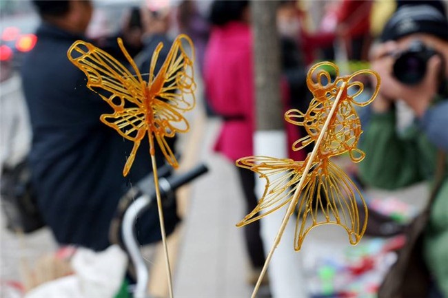 In Cina, passeggiando per le strade, nei parchi e nelle aree turistiche, può capitare frequentemente di imbattersi in artisti intenti a produrre dipinti utilizzando zucchero.L’artista siede su di uno sgabello in legno, di fronte ad una lastra di marmo levigata al centro, ed al suo fianco si trova un piatto di legno dipinto con figure popolari della cultura cinese come draghi, pesci, scimmie, cani, uccelli o vasi di fiori. Al centro del piatto di legno è collocata una freccia di bambù, che i bambini si divertono a far girare finchè si fermerà su uno dei soggetti rappresentati, che verrà riprodotto dall’artista. Per realizzare un dipinto, l’artista utilizza zucchero raffinato o di canna come materia prima, un cucchiaio di bronzo ed una spatola come strumenti e la lastra di marmo come “tela”. Per liquefare lo zucchero, questo viene cotto in una pentola per poi essere utilizzato all’istante, prima che si solidifichi di nuovo.Adoperando il cucchiaio di bronzo, l’artista preleva lo zucchero liquido dalla pentola per poi versarlo sulla lastra di marmo levigato, regolando il flusso a seconda dello spessore desiderato per l’uno o l’altro dettaglio della figura che vuole riprodurre. Una volta terminato il dipinto, l’artista si serve della spatola per togliere la sua opera dalla lastra di marmo i dipinti, commestibili, vengono poi esposti su sottili bastoncini di legno, che serviranno da manico per il cliente