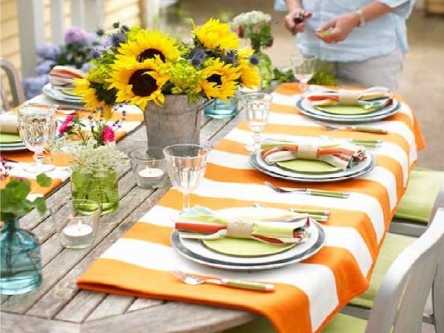 Nelle calde giornate estive è un piacere ritrovarsi per un momento di convivialità e relax, per una cena o un aperitivo informale. Momenti nei quali è importante utilizzare fiori, frutti fogliame candele e lanterne per sottolineare le situazioni: la natura ti offre gli ingredienti più stimolanti per la tua creatività, da modificare in composizioni, ghirlande, mazzolini segnaposto e bouquets che divengono complementi d’arredo decorando gli spazi interni ed esterni. Puoi esprimere con pochi semplici gesti stile e creatività, senza stancarti in complicate composizioni, anzi approfittando di questi momenti per rilassarti. Come centrotavola, una semplice ghirlanda di margherite invita al sorriso: scegli le corolle in dimensioni diverse per dare un’impressione di semplicità. Raccogli i fiori di campagna, lega i mazzolini con un filo per tenerli in ordine e componi piccoli bouquet in ciotoline di ceramica bianca per decorare la tavola; scegli anche i fiori della salute, come la camomilla, le rose, la calendula…Scegli i girasoli, re dell’estate, come messaggio di forza e di bellezza: nel linguaggio floreale augurano felicità e salute e sono ideali anche accostati a frutti di stagione. Basta collocarli in vaso, da soli o con altre fioriture estive, e completare con una decorazione di frutti di uva spina. È una pianta facilissima che potrai anche acquistare per farla crescere in vaso o in un angolo fresco del giardino. Insieme ad altri fiori estivi, come la Nerine dagli strani fiori rosa che puoi piantare il prossimo autunno in vaso o in giardino, la trovi dai fioristi in estate, le dalie stanno bene in vasi che evocano i piaceri semplici della campagna: vecchie caffettiere o teiere, tegami smaltati, brocche di ceramica…i fiori e le piante vi daranno una mano a fare un figurone con i vostri ospiti