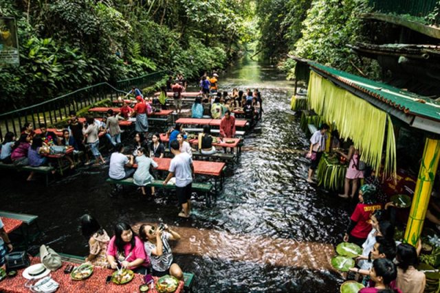 Vicino alla città di San Pablo, nelle Filippine, si trova un originale ristorante ricavato all’interno di una cascata. Il Waterfall Restaurant fa parte di un resort costruito nel 1981 dove prima si trovava una vasta piantagione di cocco. Gli ospiti possono tuffarsi nell’acqua tra una portata e l’altra. L’acqua scappata da una vicina diga, scende dalla cascata Labasin in parte naturale e in parte ricreata ad hoc per gli ospiti, scorre anche sotto i vostri piedi mentre state seduti a tavola. Il che non è da disdegnare dato che l’acqua rinfresca dalla calura del posto.