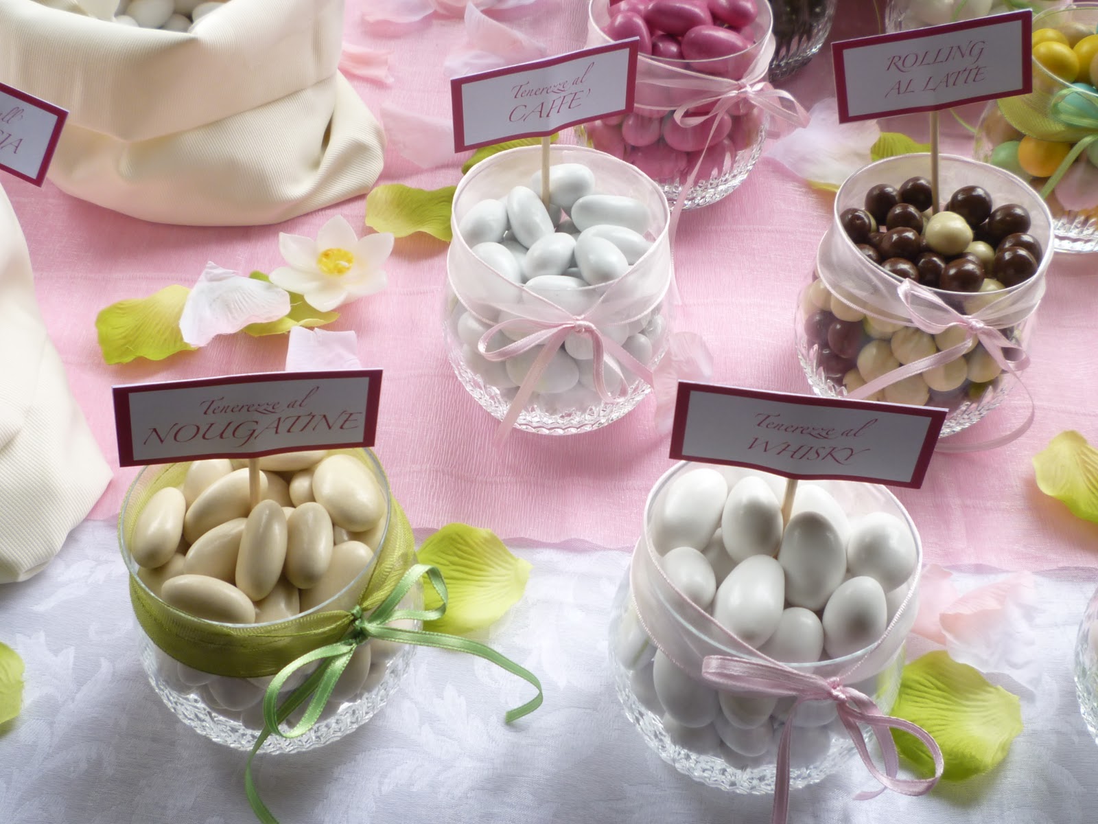 Se sull’altra riva del Mediterraneo la parola “dolcezza” fa rima con “loukoum“, il dolcetto popolare in Medio Oriente fatto con miele, mandorle e acqua di rose, sulle sponde dello Stivale è il confetto la ghiottoneria più amata da grandi e piccini: ogni occasione è buona per mangiarne uno, due, tre, quattro, cinque… Croccante e goloso a manciate, racchiude il sapore della festa e la dolcezza dei momenti felici dentro un cuore di mandorla e un guscio di zucchero bianco. Una tendenza sempre più diffusa è quella di chiudere un banchetto nuziale con l’organizzazione di un tavolo per la distribuzione dei confetti. Sarà il trionfo del palato, l’ultima dolce attenzione ai vostri ospiti prima dei saluti. Il modo ideale di proporre una confettata è allestire un tavolo con contenitori di forme diverse: vetro, cristallo, plexiglas, sacchetti in stoffa o iuta. Basterà lasciarsi guidare nella scelta, dallo stile e dai colori che sono stati usati per tutta l’organizzazione del matrimonio. Ogni contenitore avrà all’interno un gusto diverso, segnalato da un apposito cartellino. Sullo stesso tavolo verranno poi posizionati i contenitori che gli ospiti riempiranno con i confetti di loro gradimento. Oggi esistono tantissime varietà di confetti. Sbizzarritevi nella scelta dei gusti, con base alcolica e quelli al gusto di caffè o cappuccino o, ancora, frutti di bosco e cocco. Oltre ormai ai classici che sono: cioccolato al latte, fondente, bianco, gianduia, crema chantilly, zuppa inglese, nocciola, cannella. E se non avete matrimoni, comunioni o battesimi da festeggiare portateli comunque in tavola…nessuno resisterà a questa bontà