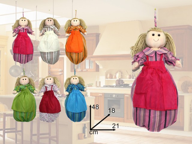 La bambola in stoffa da appendere porta sacchetti è un pratico contenitore per la vostra casa e la vostra cucina! Non avrete più il fastidioso problema di tutti quei sacchetti in giro, senza sapere come metterli. Grazie a questa bambola avrete tutte le vostre borse e sacchetti a portata di mano ma raccolte e in perfetto ordine