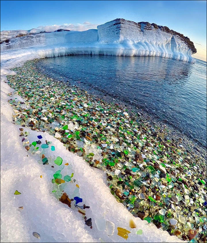 Per anni, la baia russa di Ussuri, che si affaccia sul Pacifico, è stata una discarica per bottiglie e scarti di una vicina fabbrica di porcellana. Ma la natura alla fine ha vinto, e tutti quei materiali di scarto sono diventati oggi una scogliera colorata. Molti anni fa, camionate di vetro e porcellana sono stati riversati nelle acque della baia di Ussuri, trattata sostanzialmente come una discarica. Ma oggi la spiaggia di Steklyashka è uno degli spettacoli più stupefacenti del mondo: anni di erosione e di correnti marine hanno spezzato, limato e arrotondato i barattoli, le bottiglie e ogni oggetto di vetro i e di porcellana, in coloratissimi ciottoli. La spiaggia era fino a pochi anni fa considerata una zona vietata, ma oggi è invece diventata una attrazione turistica sia per gli abitanti del luogo che per visitatori da fuori: la vista della spiaggia, incastonata tra l’acqua e la neve è infatti una vista che lascia senza parole: sono numerosi i turisti che arrivano da Vladivostock, a 30 minuti di auto, per vedere con i propri occhi questa insolita spiaggia dai colori caleidoscopici.