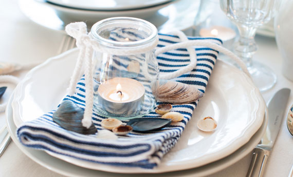 L’estate è la stagione perfetta per ritrovarsi e quale miglior posto che seduti a tavola se il tuo pranzo o la tua cena si svolgeranno in una casa al mare o il menù è a base di pesce, la scelta più consona che puoi fare è adattare il tema marino anche all’apparecchiatura della tavola. Puoi sistemare un runner blu su una tovaglia bianca o sul tavolo nudo, e adagiarci su conchiglie lanterne e decorazioni marine. Al centro della tavola, potrebbe fare da padrona un vaso in vetro da riempire per metà con della sabbia e arricchito con delle conchiglie, per richiamare la presenza della spiaggia sulla tavola. Intorno lanterne con candele accese creeranno la giusta atmosfera con il rumore delle onde che si infrangono sulla riva, prepara degli antipasti e servili in comode ciotoline finger food non dimenticarti di un vino bianco frizzante e fresco e cucina piatti semplici e leggeri che abbiano dentro tutto il profumo del mare