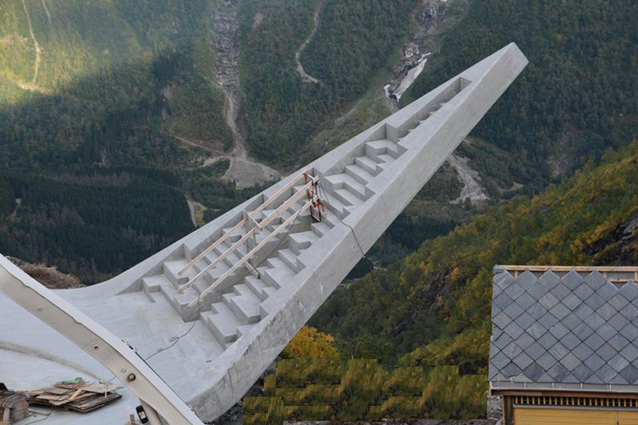 Esiste un posto dove per ammirare il panorama non si dovranno più fare i “salti mortali” e nemmeno sporgersi pericolosamente per fare delle belle fotografie. Sarà possibile camminare su una scala fatta di lastre di cemento e rimanere sospesi nel vuoto. Gradino dopo gradino si avanza fino a rimanere a mezz’aria. Una vista panoramica mozzafiato ininterrotta che porta verso le montagne ad un’altezza di 1500 metri sopra un suggestivo canyon, in Norvegia, dove si potranno scattare meravigliose foto ammirare panorami mozzafiato. L’idea sembrava impossibile e gli architetti per poterla realizzare hanno dovuto superare non poche sfide, tra cui le condizioni atmosferiche, la mancanza di elettricità, l’assenza di una connessione internet, la scarsa ricezione dei telefoni e, per finire, la strada dove il cemento e altri materiali sono stati trasportati è lunga e tortuosa e chiusa durante l’inverno. Utsikten, che in norvegese significa ‘The View’, è un piazzale panoramico tra le montagne ed è arroccato “precariamente” sul lato della Gaularfjell National Tourist Route, una delle più suggestive strade panoramiche della Norvegia. L’obiettivo principale è quello di creare qualcosa di funzionale che sfrutti al massimo tutte le possibilità che questo luogo magico offre. Se lo scopo è accentuare le qualità del luogo, il risultato finale è quello di offrire al pubblico un’esperienza visiva spettacolare. La struttura, immersa tra piante arbusti e rocce, è nell’insieme un’ampia superficie di cemento a forma triangolare, con gli angoli rialzati che puntano verso nord, sud e ovest. Ogni estremità è a forma di triangolo e in relazione al paesaggio si inclina di conseguenza. “The view” è un oggetto che vuole stimolare il movimento fisico e l’interazione con i visitatori, ed ecco perché su ogni triangolo si sale come fossero delle scale, percorrendo enormi gradoni in marmo. La struttura è anche in grado di ospitare eventi e funziona come un’arena.