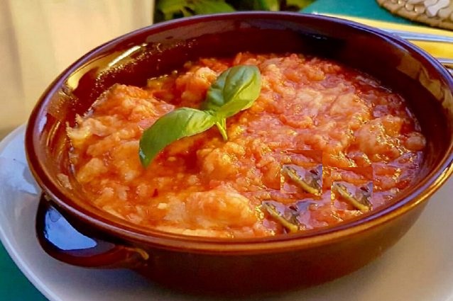 Piatto povero tipicamente toscano, la pappa al pomodoro è un classico della nostra tradizione, legato ai migliori ingredienti delle nostre campagne e alla semplicità che caratterizza le basi della cucina mediterranea. Buonissima calda durante l’inverno, è una scoperta di profumi e sapori anche d’estate, (in particolar modo quando i pomodori cominciano a maturare in maniera spontanea negli orti), consumata a temperatura ambiente. Può essere preparata, secondo i gusti, con un soffritto di cipolla, carota e sedano, con un soffritto più delicato di porri oppure con aglio.Noi ve la proponiamo nella sua versione più classica 800 g di pomodori pelati 1 mazzetto di basilico 2 spicchi d’aglio sale e pepe q. olio extra vergine 1 lt di brodo vegetale 4 fette di pane raffermo tipo toscano Passate i pomodori al setaccio riducendoli in polpa; dopo aver imbiondito uno spicchio d’aglio con qualche cucchiaio di olio disponete sul fondo del tegame le fette di pane e strofinatele con l’altro spicchio d’aglio. Versate quindi la passata di pomodoro e il brodo vegetale, fin a coprire completamente il pane. Abbassate il fuoco al minimo, coprite e lasciate sobbollire per 30/40 minuti, fino all’assorbimento del liquido. Mescolate ogni tanto per aiutare il pane a sbriciolarsi e amalgamarsi al pomodoro .Spegnete il fuoco, aggiungete qualche foglia di basilico e un ultimo generoso filo di olio a crudo. Che dire…qui cominciamo ad avere una certa fame…
