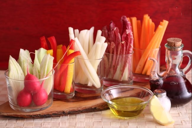 Il pinzimonio è uno dei modi più classici per servire le verdure crude, tagliate a bastoncini, a strisce o a pezzetti. Tante sono le verdure che possono essere usate per rendere colorate le nostre tavole.!Il pinzimonio tradizionale prevede una salsa a crudo fatta con olio d’oliva, sale e pepe. I più vi aggiungono anche l’aceto o il limone, da sbattere poi con una forchetta per creare una specie di emulsione. Esiste anche una ricetta siciliana, dove, sono previsti anche altri ingredienti: pomodoro pelato, aglio, menta e un po’ d’acqua. Da provare assolutamente! Puoi proporre anche diverse salse, a seconda dei gusti, arricchendo la base con molti altri ingredienti. Ad esempio puoi aggiungere: senape, rosmarino e limone, oppure origano, aglio, succo di pomodoro, peperoncino in polvere e anche prezzemolo, aglio, menta e limone, anche lo yogurt condito con un po’ di olio ed erbe aromatiche a piacere, può essere un suggerimento in chiave leggera del pinzimonio.Per un pinzimonio che si rispetti puoi preparare delle carote non troppo grosse (raschiate con un pelapatate più che sbucciate), tagliate a bastoncino, delle coste di sedano private dei fili interni e della parte più chiara, ravanelli spuntati e lasciati interi, cuori di finocchi a spicchi e foglie di indivia belga. Disponi le verdure in un piatto tondo a raggiera e prepara delle ciotoline individuali con olio, sale e pepe. Ognuno intinge le proprie verdure nella ciotolina prescelta, mescolando bene prima di mangiarle. Ma in realtà, se ci pensi, qualsiasi ortaggio può essere oggetto di condimento, quindi anche cipolle, peperoni, carciofi, pomodori, lattuga… Insomma, ogni ingrediente che ti viene in mente può entrare a far parte del grande Partito del Pinzimonio, come ironizzò una volta Roberto Benigni!