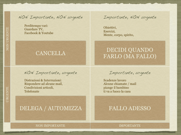 Iniziamo spesso la giornata con buoni propositi, tanta energia e una lista di cose da fare. Poi, senza che ce ne rendiamo conto, va tutto a rotoli: una riunione improvvisata e andata male, il collega che ha la luna storta e se la prende con noi, la macchina che non parte. E tutto il pensiero positivo finisce sommerso da montagne di faccende da sbrigare, mentre la confusione e l’ansia prendono il sopravvento. Niente panico, è ancora tutto recuperabile. Occorre spostare il focus sulla propria energia e canalizzarla nella sistemazione della giornata. Come si fa? Molto semplice…Esistono solo due tipi di “cose da fare” sul lavoro: quelle urgenti e quelle importanti. Le cose urgenti non sono quasi mai importanti. Quelle importanti non sono quasi mai urgenti. La vera svolta nella giornata lavorativa avviene quando stabiliamo cosa è urgente e cosa è importante. Ecco suggerito il metodo del grafico: dividere un foglio A4 orizzontale in 4 parti e fare due frecce, una che va dal basso verso l’alto, e l’altra che parte da sinistra e va verso destra. La prima freccia rappresenta le mansioni urgenti, la seconda quelle importanti. In questo modo si raffigurano chiaramente le mansioni che sono urgenti ma non importanti, e pertanto possono essere delegate a qualcun’altro, e quelle importanti e anche urgenti, e quindi che vanno affrontate subito. Quelle importanti ma non urgenti, si può decidere dopo aver svolto quelle importanti e urgenti, quando farle. E così via. Priorità, una dopo l’altra.Il capitalista Sam Altman, ha dichiarato che una delle più grandi problematiche del nostro tempo sul lavoro sono le distrazioni da social media. In media si controlla il cellulare fino a 150 volte al giorno e questo compromette in modo significativo la produttività lavorativa. Gli esperti consigliano di dedicarsi alle attività più impegnative la mattina, e il pomeriggio concedersi più relax.Infine, molto importante è concedersi le pause durante la giornata: fare un’attività impegnativa di un‘ora, e poi concedersi 10 minuti di break per ricaricare le batterie del cervello.